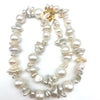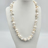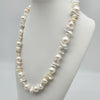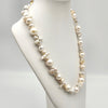An eye catching celebration of pearl treasure. This strand combines the round elegance of  cultured pearls with the organic uniqueness of keshi pearls. Each baroque and near-round pearl creates a multidimensional effect. Hand knotted between each pearl and fastened with an easy to use gold plated bolt clasp comprising of 52 baroque, 6 nugget and 11 near round, white  pearls with excellent lustre.